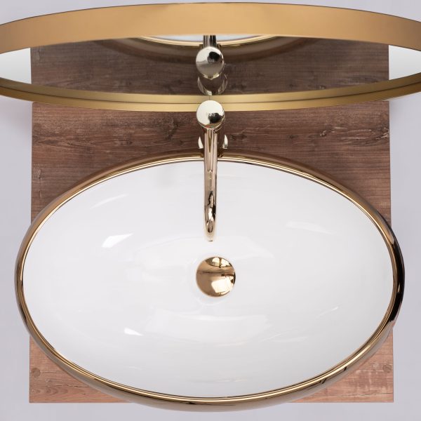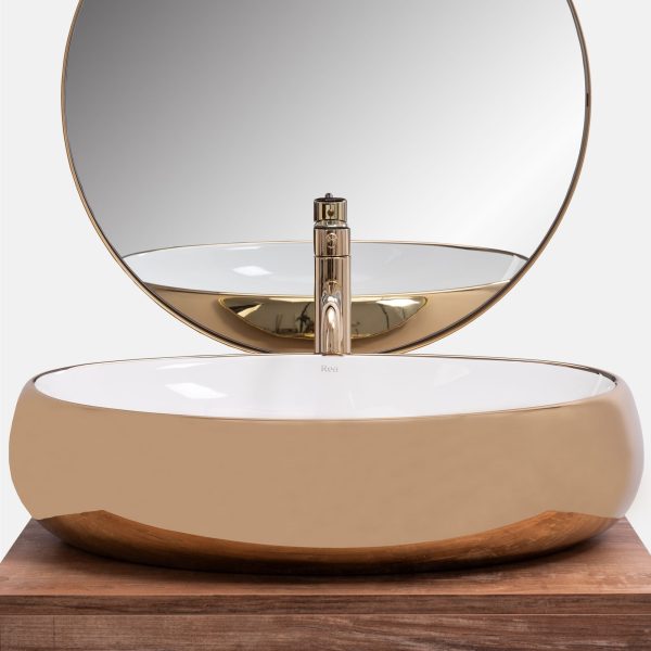 Umywalka Melania Gold należy do kolekcji umywalek Melania, w której znajduje się również wiele innych wariantów umywalek Melania. Zewnętrzna powłoka jest pokryta szkliwem o złotym wykończeniu, dzięki czemu umywalka wyróżnia się na tle całej łazienki, zwracając uwagę każdego gościa.