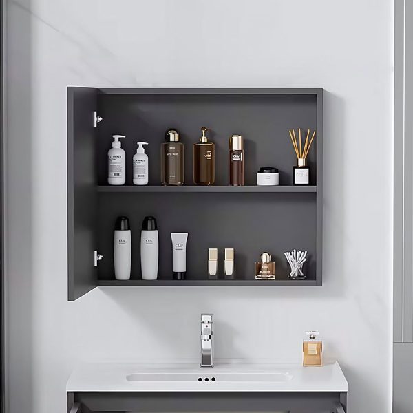 Un set de mobilier de baie funcțional și modern este o soluție gata pregătită pentru amenajarea unei zone de spălare practice. Setul include un dulap suspendat cu lavoar ceramic, precum și un dulap cu oglindă și rafturi laterale pentru depozitarea ușoară a produselor cosmetice zilnice.