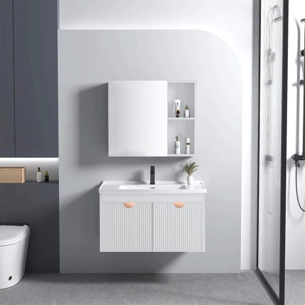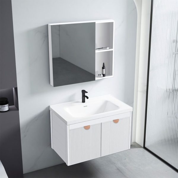 Un set de mobilier de baie funcțional și modern este o soluție gata pregătită pentru amenajarea unei zone de spălare practice. Setul include un dulap suspendat cu lavoar ceramic, precum și un dulap cu oglindă și rafturi laterale pentru depozitarea ușoară a produselor cosmetice zilnice.